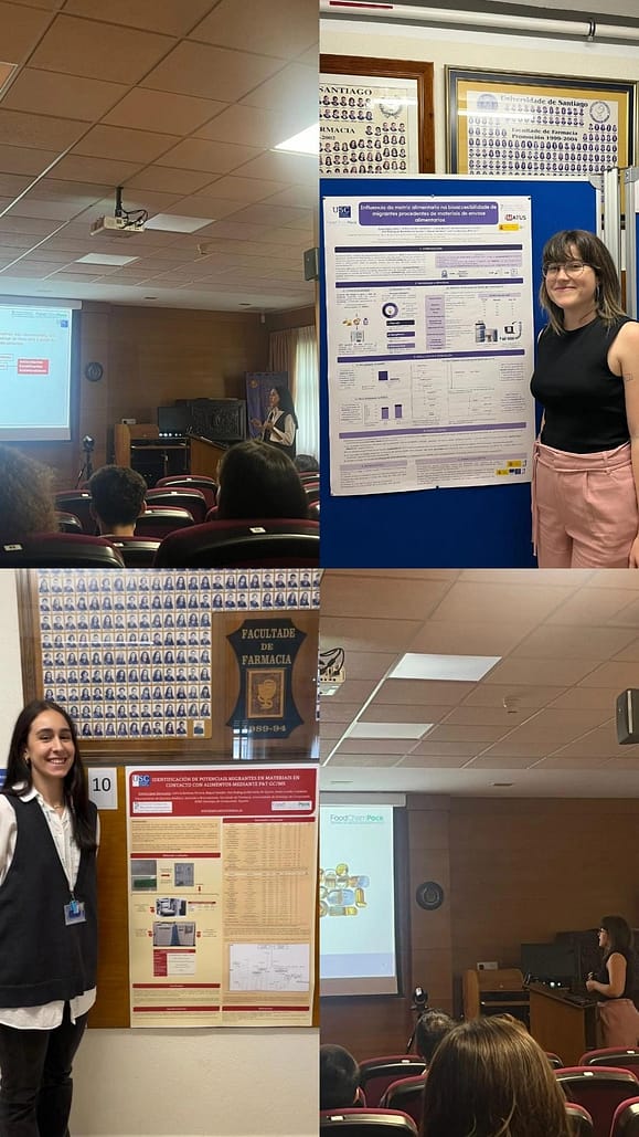 As nosas compañeiras, Lara Pazos Soto e Emma López Sanvicente, presentaron esta mañá os seus traballos sobre a influencia da matriz alimentaria na bioaccesibilidade de migrantes procedentes de materiais de envase alimentarios, e a identificación de potenciais migrantes en materiais en contacto con alimentos, respectivamente. As presentacións, tanto oral como en formato póster, tiveron lugar no V Encontro Galego da Mocidade Investigadora en Ciencias Farmacéuticas, celebrado na Facultade de Farmacia da Universidade de Santiago de Compostela.